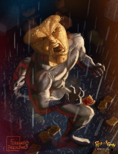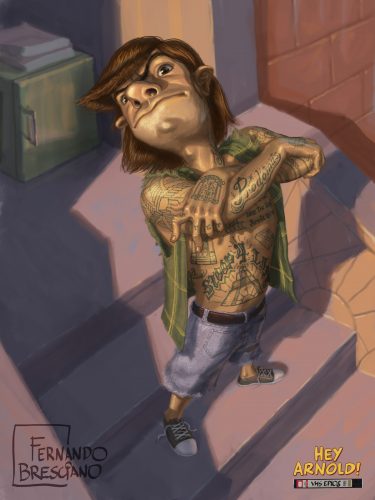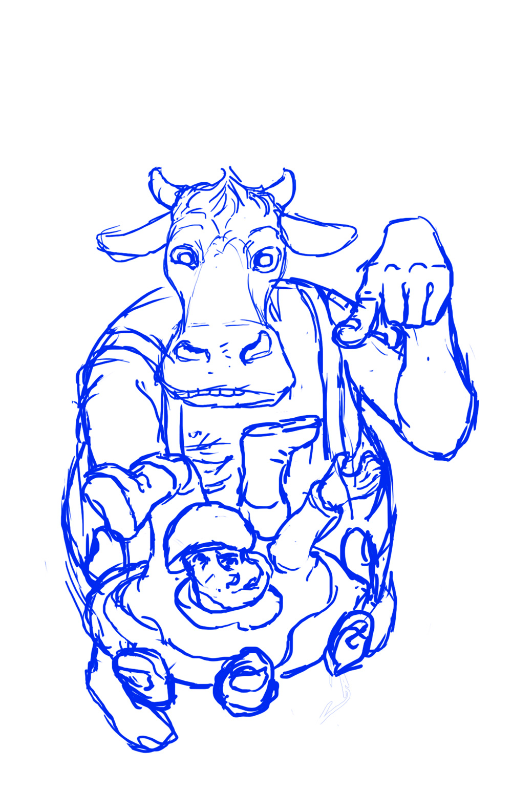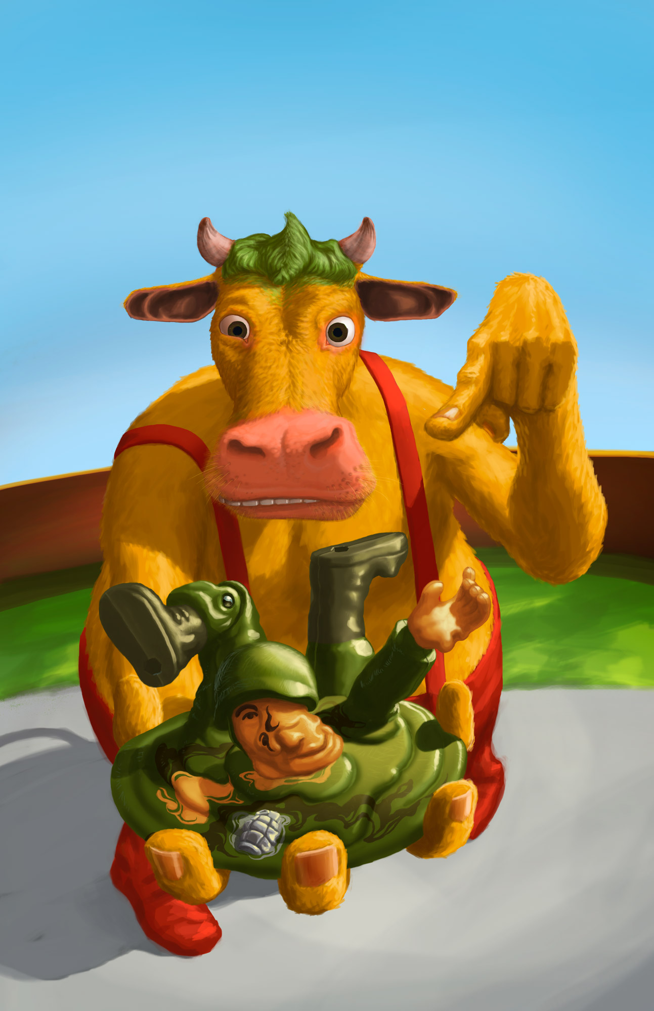 Heffer is obviously a yellow steer, so not much to invent there. The little whiskers on the snout and the hair colour transition to green were a bit tricky. With Jimbo I wanted to try out drawing a liquid marble effect on a rigid surface. Trying to imagine how a real G.I. Joe figure could arrive to that position was a fun exercise.