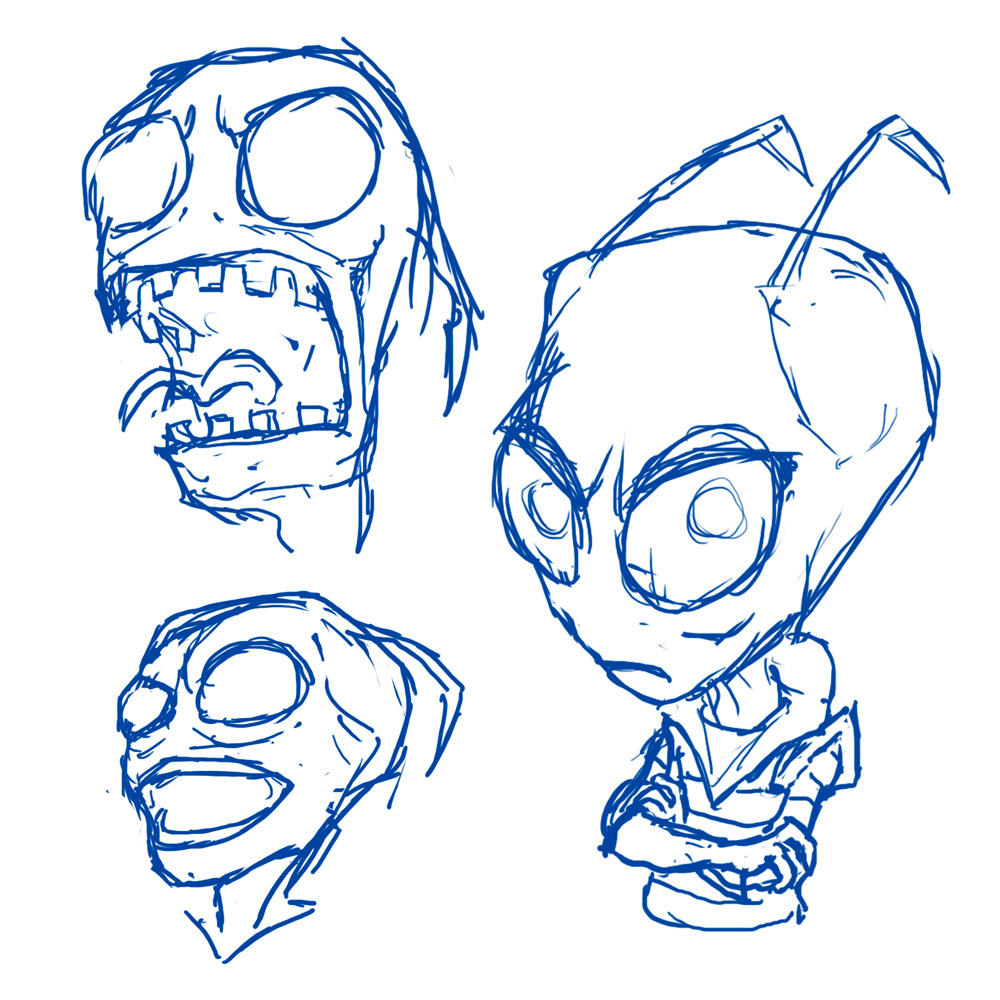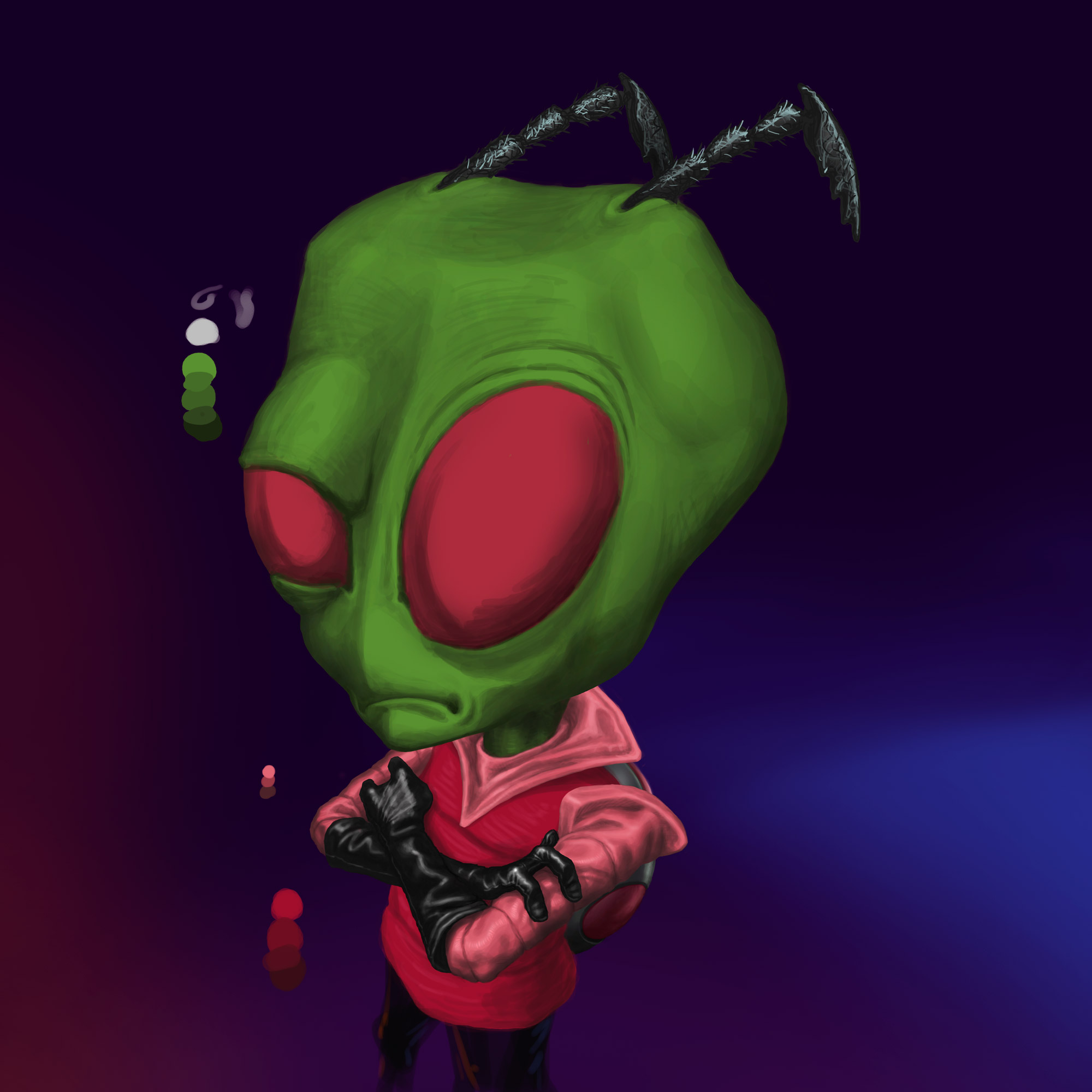 The pupil-less eyes and antennas make me think Zim could be a sort of insect, so I took this as an opportunity to render glossy surfaces with patterns. It was also interesting to imagine how Zim’s impossible facial expressions would translate to a design with anatomical limitations.