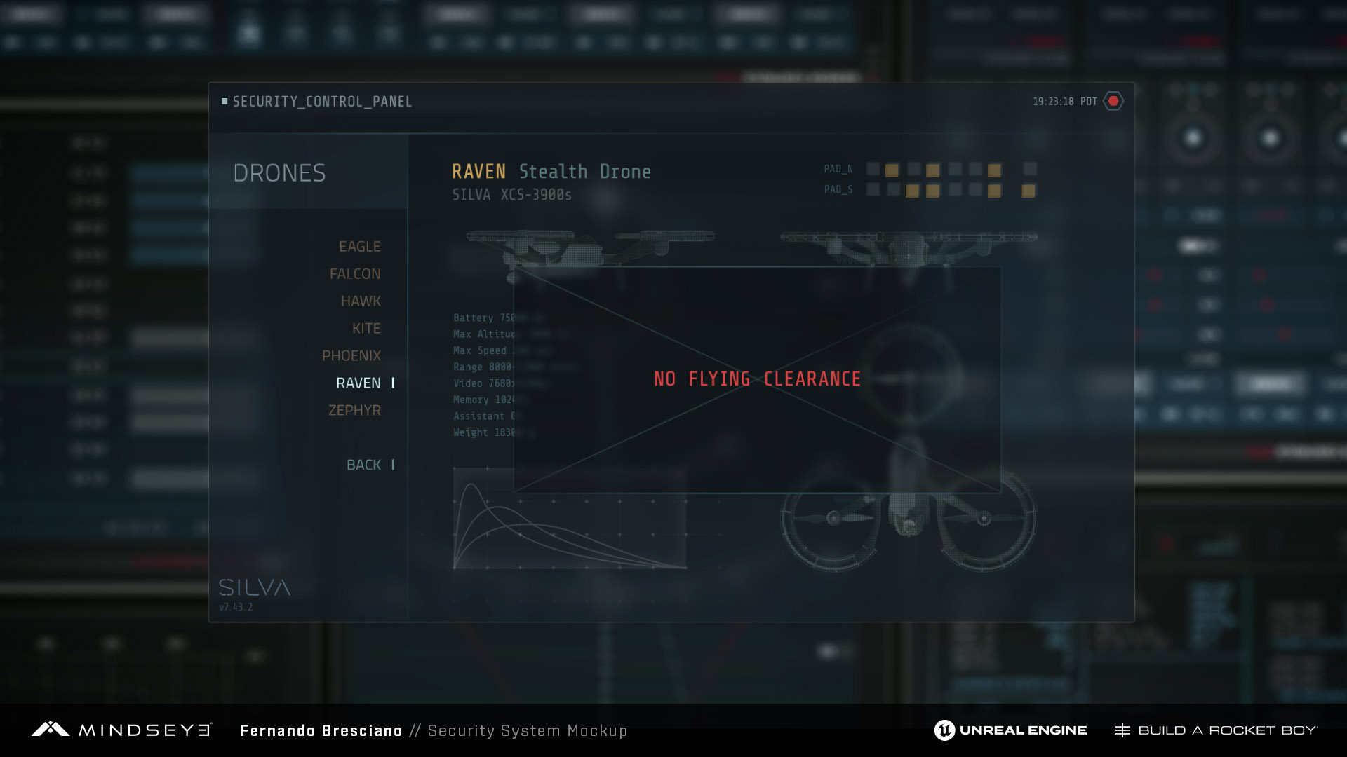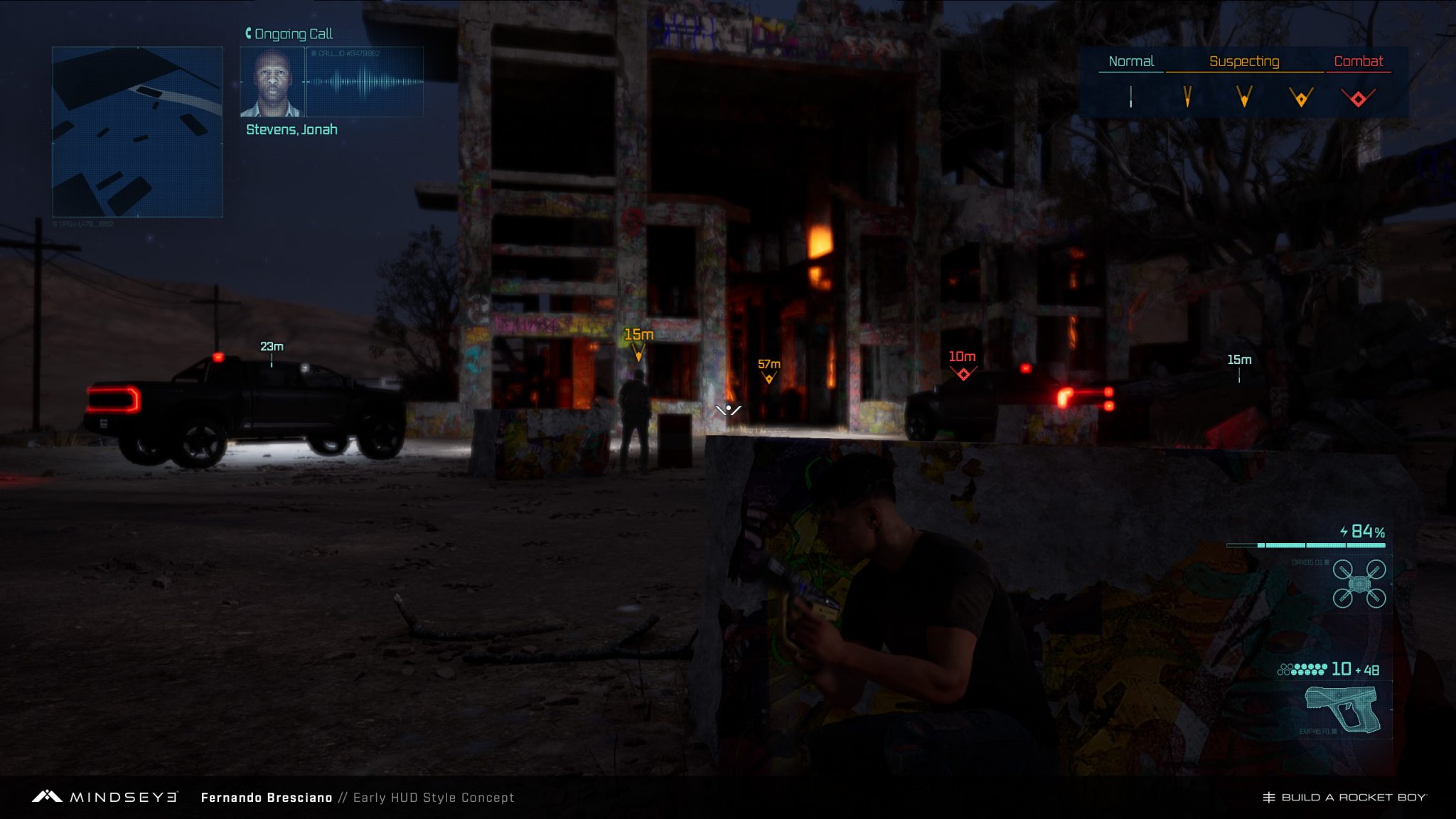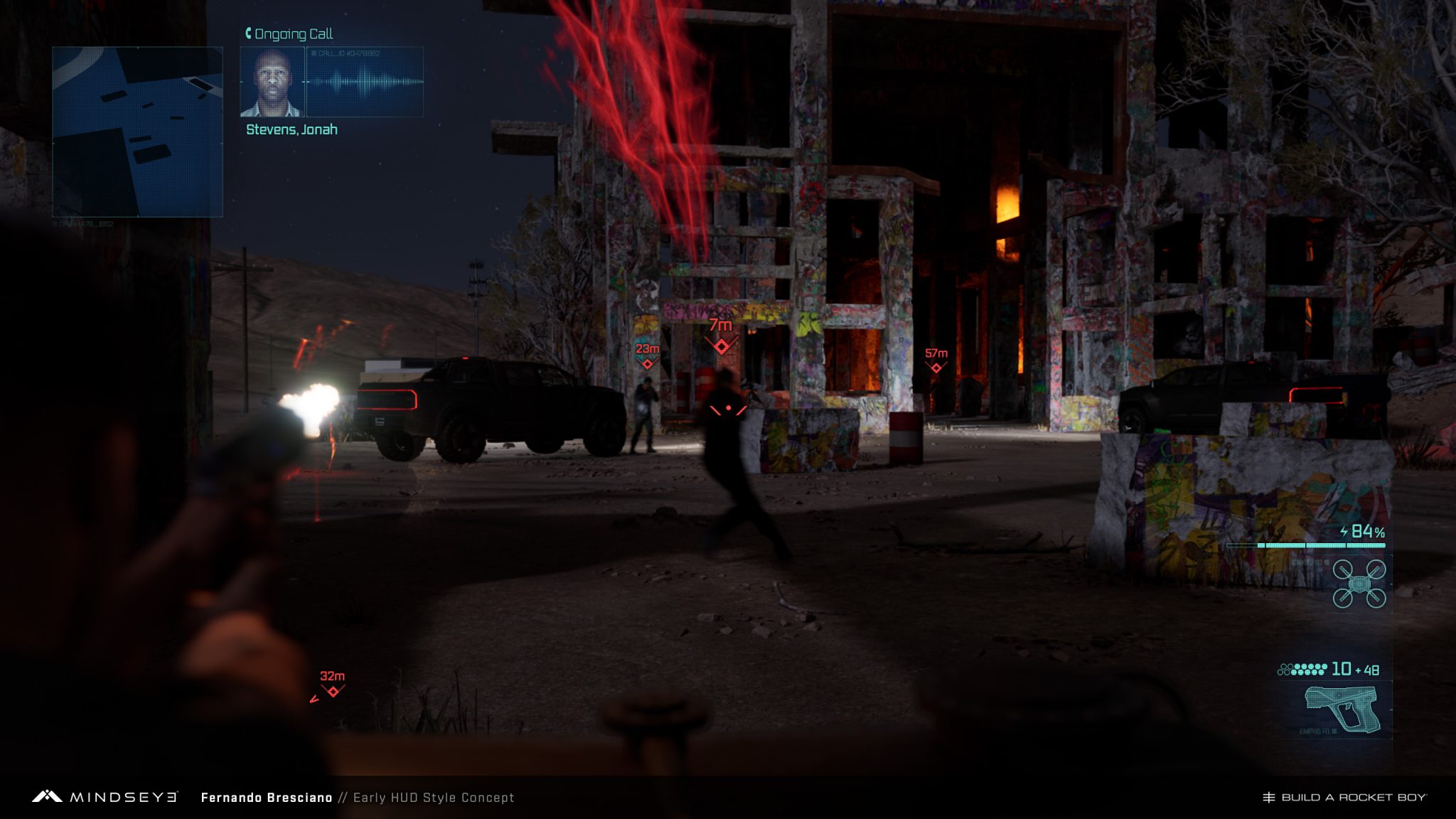 In one of the Mindseye missions, the player pilots a military aircraft equipped with homing missiles. My task was to design the AR markers for lockable targets and the HUD reticle defining the target-lock area. The goal was to achieve a no-nonsense military style while maintaining a near-future aesthetic.